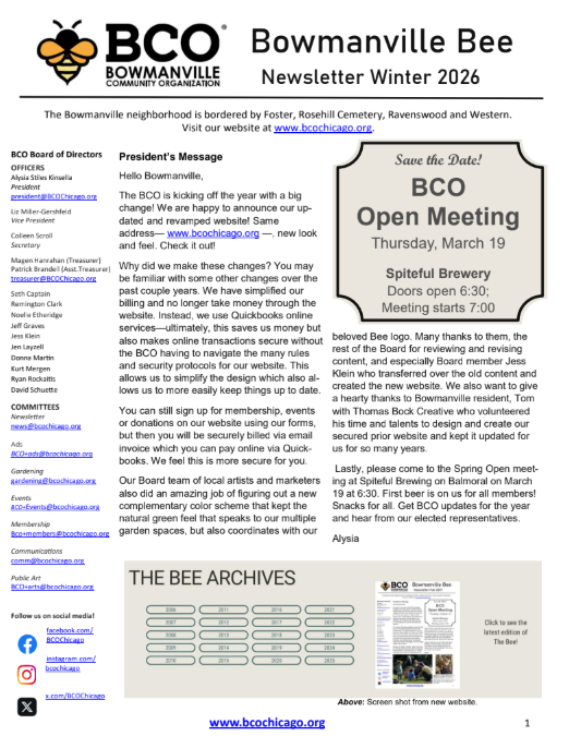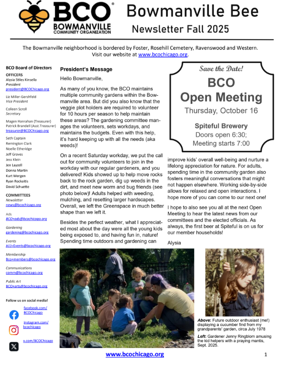 BowmanvilleCOMMUNITY ORGANIZATION Serving Chicago and the community since 1987 THE BEENEWSLETTER BEECOME A MEMBER BEEINVOLVED BCO Events Calendar
